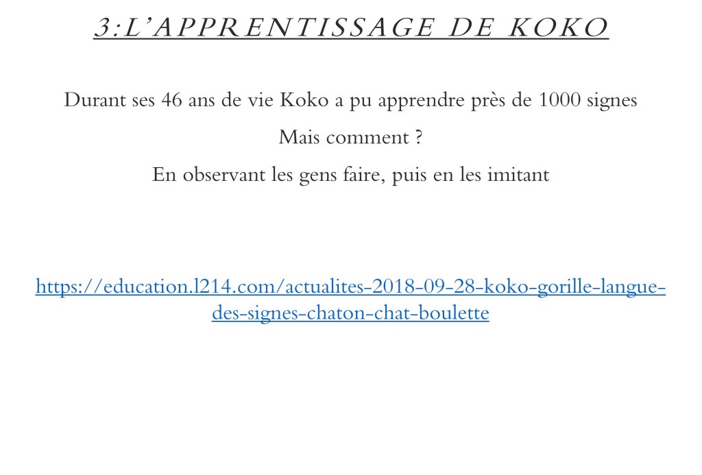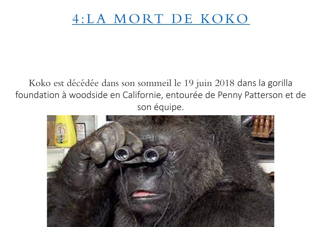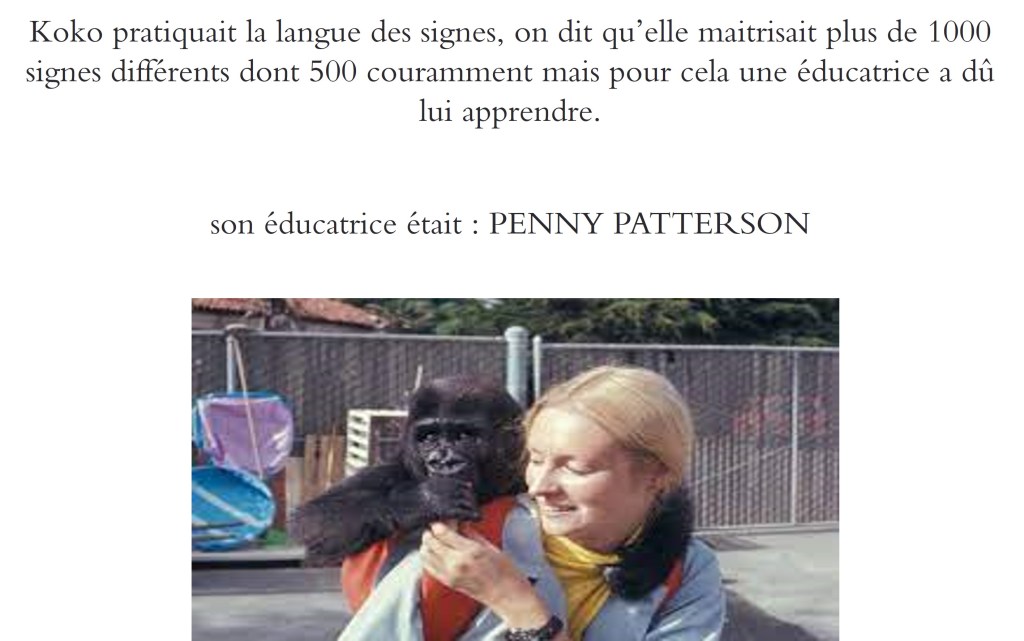 Koko Publié par410clubpresse10 février 2022Publié dansNon classé Koko, la gorille qui parlait la langue des signes Partager : Partager sur X(ouvre dans une nouvelle fenêtre) X Partager sur Facebook(ouvre dans une nouvelle fenêtre) Facebook J’aime chargement… Similaire